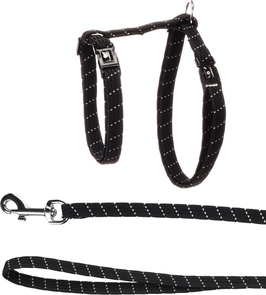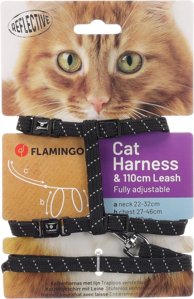 ¡Con el arnés y la correa Elza en negro, tu gato puede salir con estilo! Este arnés ajustable sin escalones está hecho de nylon y cuenta con cierres de clic prácticos. Los detalles reflectantes garantizan una mayor seguridad. ¡Haz que tu gato brille durante sus paseos juntos!