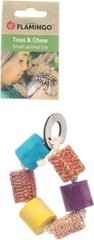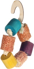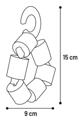 ¡Cuelga este juguete mordedor para tu pequeña mascota roedora! Hecho de madera, maíz y sisal, perfecto para morder. Mantiene los dientes cortos y saludables. Con práctico gancho de madera para colgar.