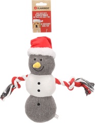 Un juguete para perro con forma de muñeco de nieve tiene brazos hechos de nudos de algodón, ideales para que tu mascota los muerda y tire. El cuerpo del muñeco de nieve es suave y festivo, con detalles como bufanda y gorro, ofreciendo una experiencia de juego interactivo y divertido, mientras cuida la salud dental del perro.