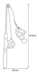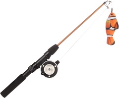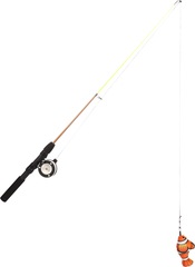 Caña de pescar diseñada para que los gatos se diviertan y se mantengan activos. La caña de pescar está compuesta por una varilla de plástico resistente, con un peluche de poliéster suave en la parte final que representa la forma de pez payaso. La varilla de plástico es lo suficientemente resistente como para soportar el movimiento y las sacudidas de los gatos mientras juegan con el peluche del pez payaso. El diseño del pez puede ser atractivo para los gatos y estimular su instinto de caza, ya que pueden ver al juguete como una presa potencial. El movimiento de la caña de pescar puede ayudar a simular el movimiento de una presa, lo que puede hacer que el gato se sienta más interesado y motivado para jugar.