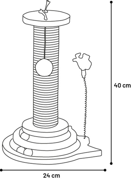 Material: madera|Poste rascador con cuerda para rascador de cáñamo (3 mm)|Con pelotitas de sisal y un muelle con plumas para que disfruten jugando|Pista de bolas con bolas de hierba gatera y bolas de madera en el interior para estimular mentalmente a su gato