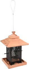 Material: madera de cedro y malla | Resistente a la intemperie y requiere poco mantenimiento | Cable metálico plastificado para colgar fácilmente | Adecuado para rellenar con frutos secos gracias al tejado desmontable | Tiene múltiples puntos de alimentación con 4 perchas | Con obstáculo para distribuir uniformemente las frutos secos | Orificios de drenaje en el fondo para evitar la acumulación de agua | Medidas: (LxAnxAl) 22cm X 22cm X 32cm
