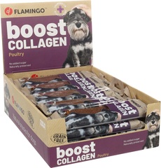 Sin cereales | No contiene azúcares añadidos | Contiene colágeno que contribuye a una piel y articulaciones más saludables | El colágeno también proporciona a tu perro un pelaje saludable y brillante | El glucosamina y condroitina añadidos potencian la eficacia del colágeno | Con conservantes naturales | Fabricado en Europa | Peso: 54gr