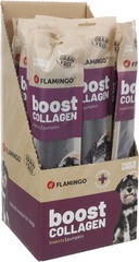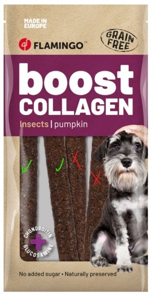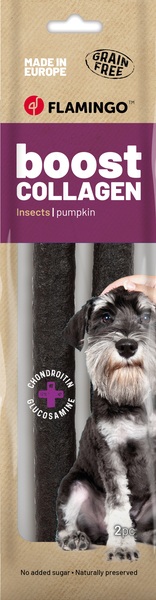 Sin cereales|No contiene azúcares añadidos|Contiene colágeno que contribuye a una piel y articulaciones más saludables|El colágeno también proporciona a tu perro un pelaje saludable y brillante|La glucosamina y la condroitina añadidas potencian la eficacia del colágeno|Fabricado en Europa