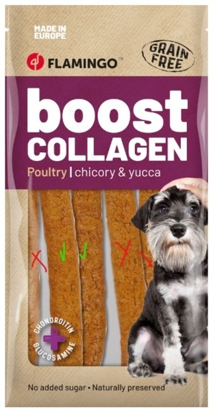 Sin cereales|No contiene azúcares añadidos|Contiene colágeno que contribuye a una piel y articulaciones más saludables|El colágeno también proporciona a tu perro un pelaje saludable y brillante|La glucosamina y la condroitina añadidas potencian la eficacia del colágeno|Fabricado en Europa