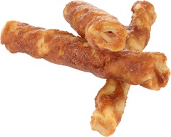 Alimento complementario para perros. | No apto para el consumo humano. | Proporcione agua fresca a su mascota en todo momento. | No administre el desoxidante que se encuentra en la bolsa. | Caducidad limitada una vez abierto el envase. | Consumir preferentemente antes de: ver sello. | Composición: Almidón de maíz (48,20%), pollo (17,40%), glicerina, carbonato cálcico, mantequilla de cacahuete (4%), fructosa, aceite de oliva, gelatina, monoglicérido, sal, caramelo. | Aditivos: Aditivos tecnológicos: conservantes: Sorbato de potasio (1k202) 0,0009mg/kg; agentes emulsionantes y estabilizantes, espesantes y gelificantes: sorbitol E420. | Constituyentes analíticos: Grasa bruta: 0,2%; Proteína bruta: 10%; Ceniza bruta: 10%; Fibra bruta: 2%; Humedad: 16%.