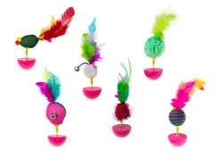 El juguete de pie consiste en un hemisferio plástico robusto sobre el cual se une un juguete textil a un resorte metálico. Los gatos están ocupados con esto por horas. El juguete rebota hacia adelante y hacia atrás cuando lo toca la parte inferior esférica. La parte superior móvil vibra y se balancea tan pronto como es golpeada por la pata del gato. Por eso, se alienta continuamente al gato a seguir jugando. La hierba gatera contenida también hace que el juguete sea aún más tentador. El juguete está disponible en diferentes diseños y se entrega en una versión ordenada.