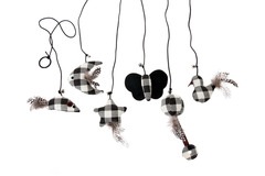 Juguetes de gato a cuadros en blanco y negro Hecho de tela gruesa tejida, similar al yute Se puede trabajar muy bien con las garras Con plumas y campanas Incita al juego. Con cordón de juego flexible con anilla para el dueño del gato Con fragancia Catnip En diferentes figuras