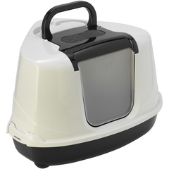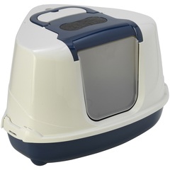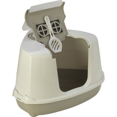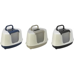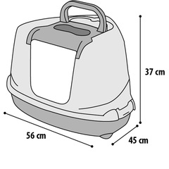 Material: plástico | Fácil de mover gracias a su asa | Incluye un filtro de carbono reemplazable que reduce las molestias por olores | Tapa extraíble con puerta abatible | Con recogedor de arena para gatos