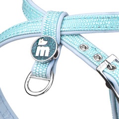 Arnés turquesa para gato y perro pequeño de la colección Saint Tropez en piel sintètica con acabados en bronce blanco. Disponible en varios tamaños: 3XS (30-36 cm)10 kg / 2XS (34-40 cm)10 kg / XS (38-44 cm) 15 kg / S (42-48 cm) 15 kg