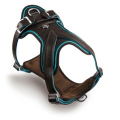 Arnés H marrón/turquesa para perro de la colección Hermitage en cuero original italiano con elegantes acabados en bronce blanco.