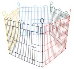 El recinto exterior Pentágono consta de cinco elementos metálicos coloridos, cada uno de 60 cm de altura. Una vez instalado, el recinto ofrece al animal pequeño un área de salida con un diámetro de 90 cm. Es adecuado para uso en interiores y exteriores.