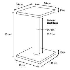 Material: felpa suave (200 g/m²) | Poste rascador con cuerda para rascador de sisal (4 mm) | Grosor placa base: 1,2 cm y diámetro poste rascador: 8,5 cm | Plataforma de descanso