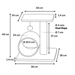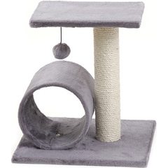 Material: felpa suave (200 g/m²) | Poste rascador con cuerda para rascador de sisal (4 mm) | Grosor placa base: 1,2 cm y diámetro poste rascador: 6,9 cm | Túnel y plataforma de descanso | Con juguete para que disfruten jugando