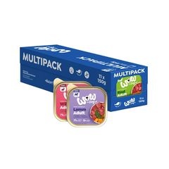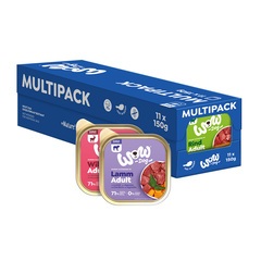 El WOW Multipack contiene 11 cuencos de 150 g en las siguientes variedades: 2 x Salmón Adulto, 2 x Cordero Adulto, 3 x Vacuno Adulto, 2 x Pavo Adulto, 2 x Venado Adulto.