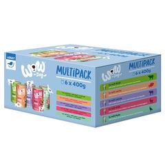 El WOW Multipack de comida húmeda de 6 latas de 400g incluyen: 2x Carne de vaca, 1x cordero, 1x pavo, 1x salmón, 1x venado.